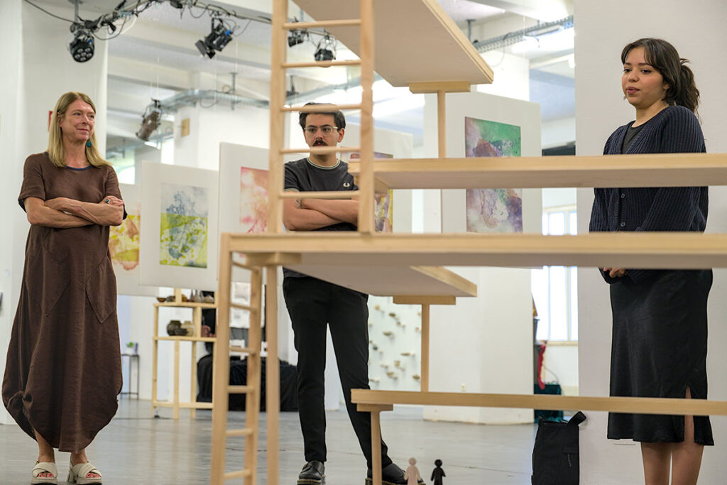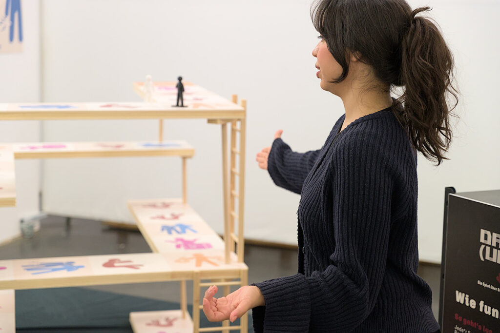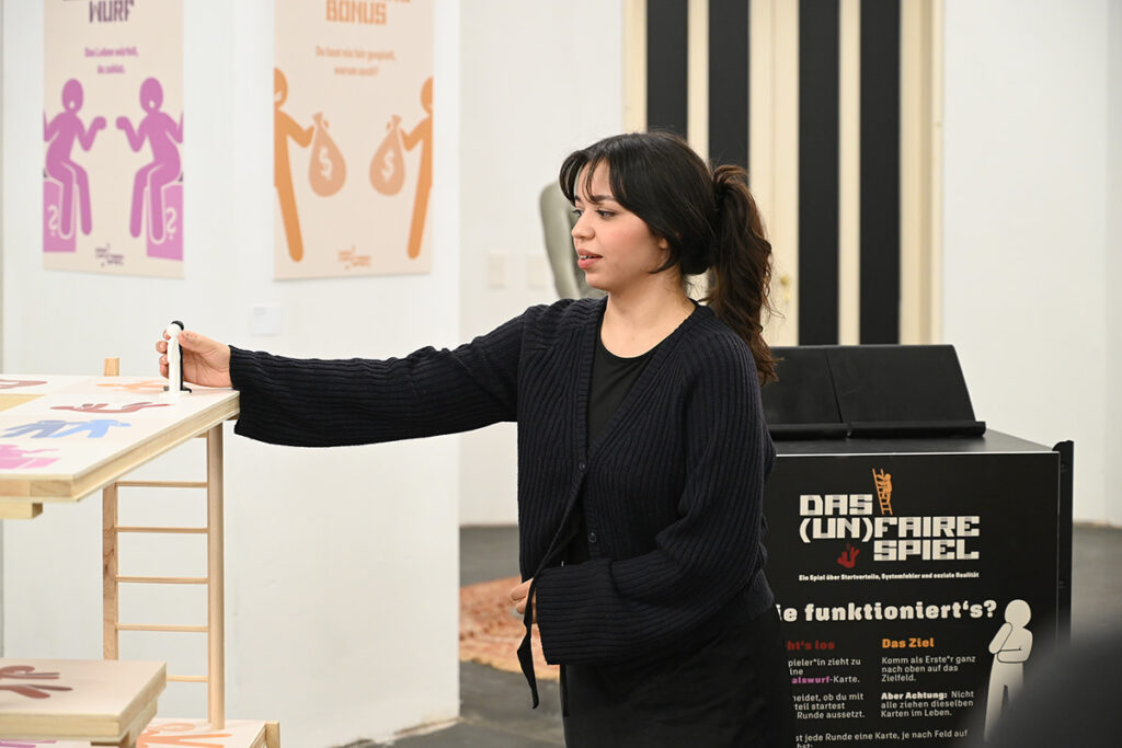 „Das (un)faire Spiel“ ist eine interaktive Installation, die gleichzeitig die Funktion eines satirischen 3D-Brettspiels übernimmt. Es kombiniert das Prinzip des Leiterspiels mit der Realität sozialer Ungleichheiten. Die Spieler*innen bewegen sich über ein Spielfeld, das verschiedene lebensverändernde Ereignisse darstellt, die durch das Ziehen von Karten ausgelöst werden. Durch gezielte visuelle Gestaltung wird die Darstellung von sozialen Unterschieden und Herausforderungen verstärkt und lädt dazu ein, sich gesellschaftskritisch mit diesen Themen auseinanderzusetzen.